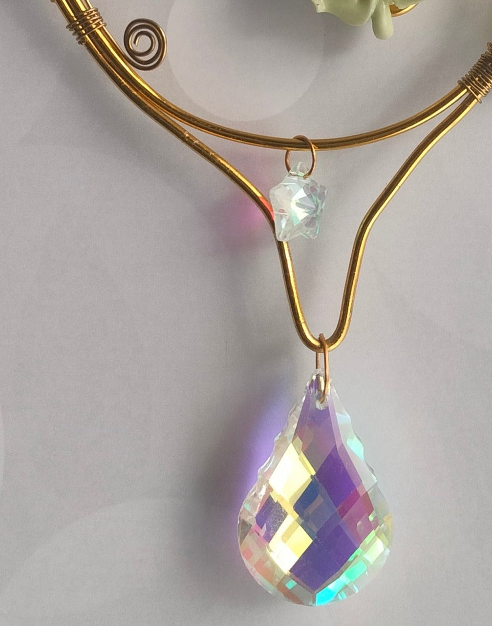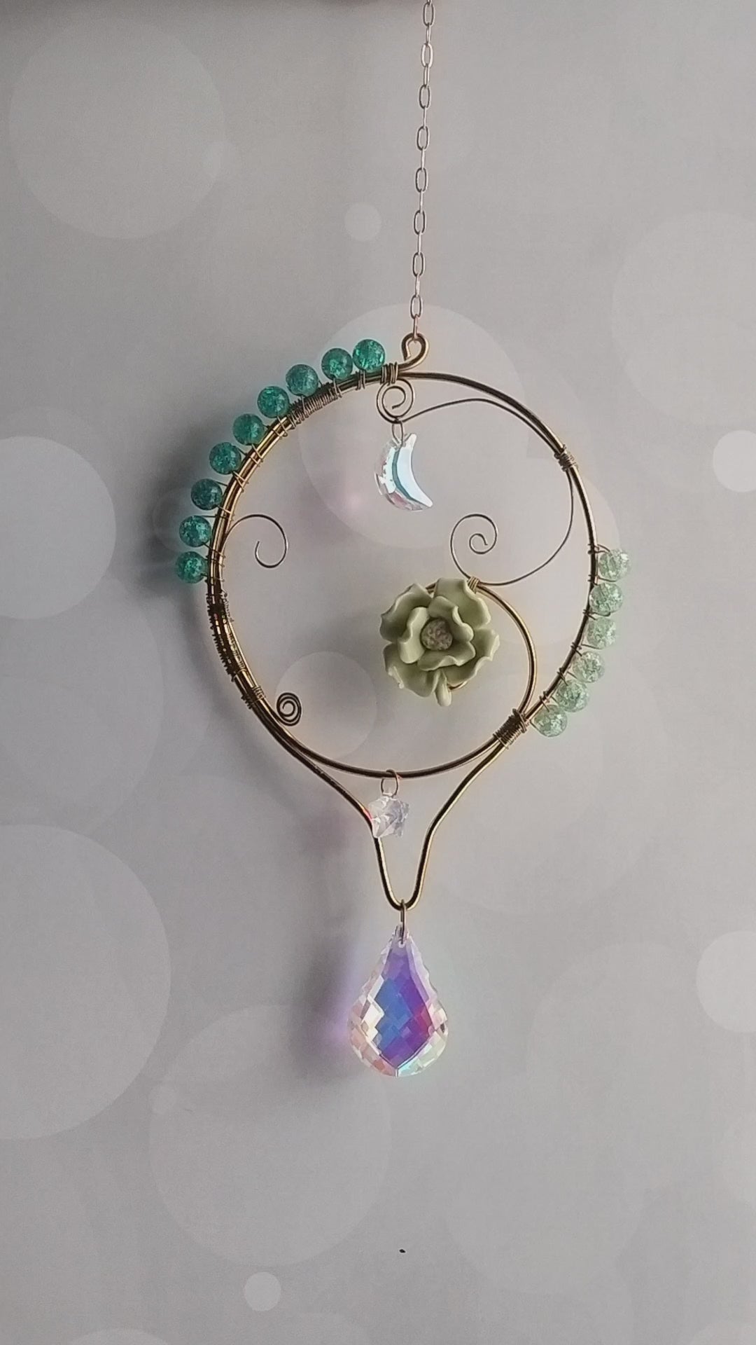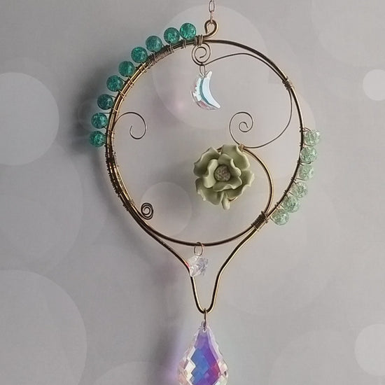 Add a touch of whimsy to your home decor with this round teal and green suncatcher. The ceramic flower, moon, and star accents are beautifully complemented by sparkling ab crystals and gold tone details. The vibrant teal and sea green glass beads will catch the sunlight and create a stunning display.